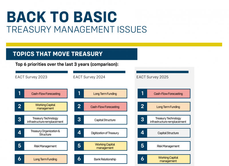 La previsión del flujo de caja se consolida como la prioridad nº 1 de los tesoreros europeos según la de la Asociación Europea de Tesoreros Corporativos (EACT), “Encuesta EACT 2025″ de la que ofrecemos un resumen: