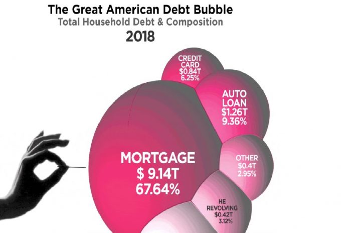En este contexto, no puede extrañar que ahora se ponga sobre el tapete la posibilidad de un riesgo de estallido o pinchazo de la deuda norteamericana, la pública y la privada. Según un analisis de la web howmuch, que cita informes del Federal Reserve Bank of New York’s Center for Microeconomic Data, la deuda pública norteamericana está creciendo de forma constante en los últimos años hasta acercarse a los 22 billones de dólares, lo que supone el 137% del PIB, situándose en el top de los niveles de endeudamiento público de cualquier otro país, lo que llevaría a preguntarse “cuánto falta para que estalle la burbuja de la deuda de Estados Unidos”.